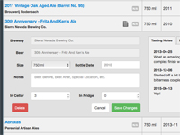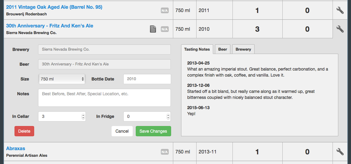 One of the first things you'll notice in the included screenshots is a change in aesthetics. While the overall user experience should remain largely the same when it comes to managing your cellar (though faster and easier; see below), the site's palette has changed. While not one hundred percent locked down, I'm pretty happy with the shift after extensive use and find that the darker take makes things a bit more readable (and a lot less like an out-of-the-box Bootstrap UI).
